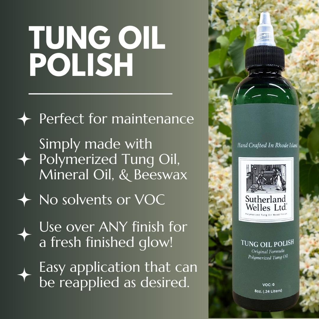 Tung Oil Polish is the perfect maintenance product that can be used over any of our other products to renew a surface. The product is a combination of our Polymerized Tung Oil, Mineral Oil and Beeswax.